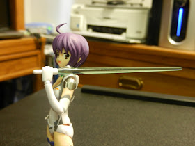 Base Articulation:  Honestly, for a Bandai fig, this has all the anatomy and movement of a figma. Besides the smell of plastic and paint that comes with a figma, you would think that it is if you didn’t look at the box, or the holes in her legs. The joints are figma joints…plain and simple. However, don’t think this means that figma joints are the only thing this toy is about. Ankles, knees, and thighs move as you would expect, but expect some rigidness at the top of the legs, since the there is a skirt piece at Yukina’s waist that limits the range of motion. The same thing happens again at her shoulders. They will not move as freely you may hope, because of her shoulder armor getting in the way. Her hands and arms work just fine though. Be careful of the arms. Unlike figures of men that use muscle to hide and mask articulation (Guts, Goku, Revoltech Ken, etc.), her skinny arms will wear thin from removal and applying of the armor, as well as playing with it too much in general. Stomach area and top torso are two separate pieces, linked by what I assume is a ball joint. Her neck is a thicker figma joint that pegs into the back hair piece of her head. Her head moves just as well as you need it. Nothing lacking there.